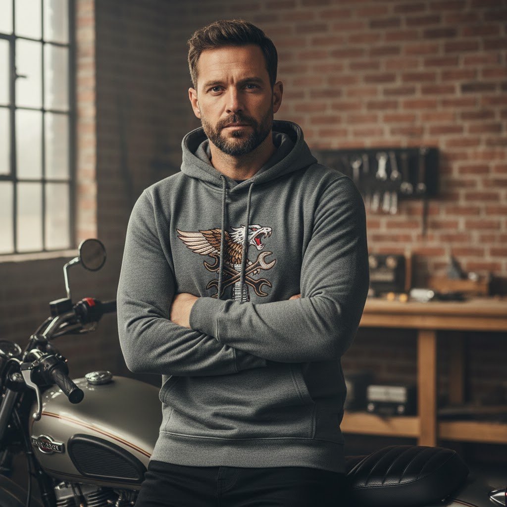 As an avid biker, I'm always looking for gear that's both functional and stylish. The 'Open Road' Hoodie from Biznisscorner.com checked all the boxes. The material is surprisingly warm and cozy for those cooler morning rides, and the Winged Piston embroidery is absolutely stunning – it adds a touch of class that printed hoodies just can't match. It's held up beautifully after several washes, maintaining its shape and design.